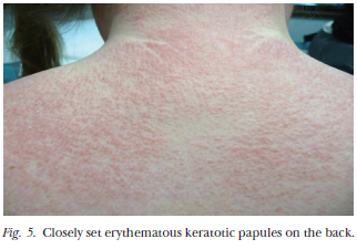まあ毛孔性紅色粃糠疹自体がそもそもピンと来ていないのだが..毛孔に一致した角化性丘疹に要注意というところ?生検をよく見たら鑑別自体はできるよう.